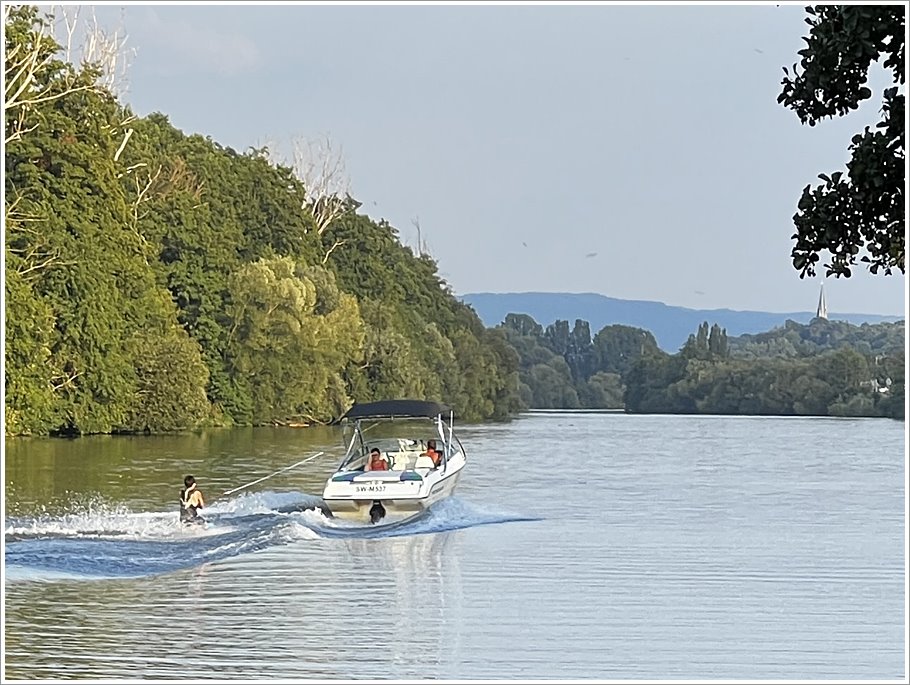 Wir wollen den Main jetzt verlassen. Unser Platz lag ganz nah am Wasser und wir haben Berufs- und Flusskreuzfahrer gesehen, und zum ersten Mal konnten wir auch ein Peilschiff beobachten. Die Johannes Kepler pendelt hier zwischen Schweinfurt und Bamberg. Noch viel mehr noch haben uns die Freizeitschiffe mit Wasserskifahrern und nachgeschleppten Badeinseln amüsiert. Die gibt es hier zu Hauf und man fragt sich, warum nur Autofahrer verteufeln? Was ist eigentlich mit dem sinnlosen Hin- und Herfahren übergroßer Motorboote?