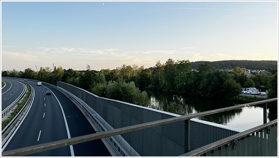 Wo landen wir heute? Vielleicht Forchheim am Main-Donau-Kanal? Der Stellplatz liegt auf der Sportinsel, Zufahrt über eine Brücke für max. 5,5 to, die Parzellen für 8 Meter geeignet, zum Teil auch länger. Der Weg in die Altstadt führt über eine Fußgängerbrücke, und bis zum Brauhaus sind es nur 850 Meter. Die Brücke geht gleichzeitig über den Kanal und die Autobahn gen Nürnberg.