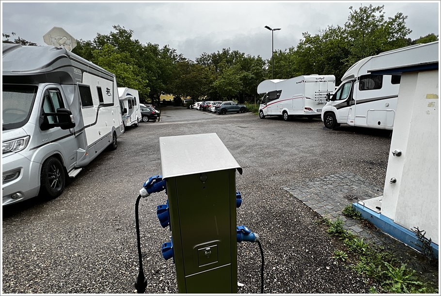 Unser Ziel ist jetzt Amberg, der Weg dorthin gut 40 km, führt über Sulzbach. Susanne liest und findet dort auch einen Stellplatz direkt bei der Altstadt. Ok, Abstecher nach Sulzbach. Es gibt vier Stellflächen am Rand eines öffentlichen Parkplatzes (und acht Stromanschlüsse!). Ein Platz ist noch frei, unser.