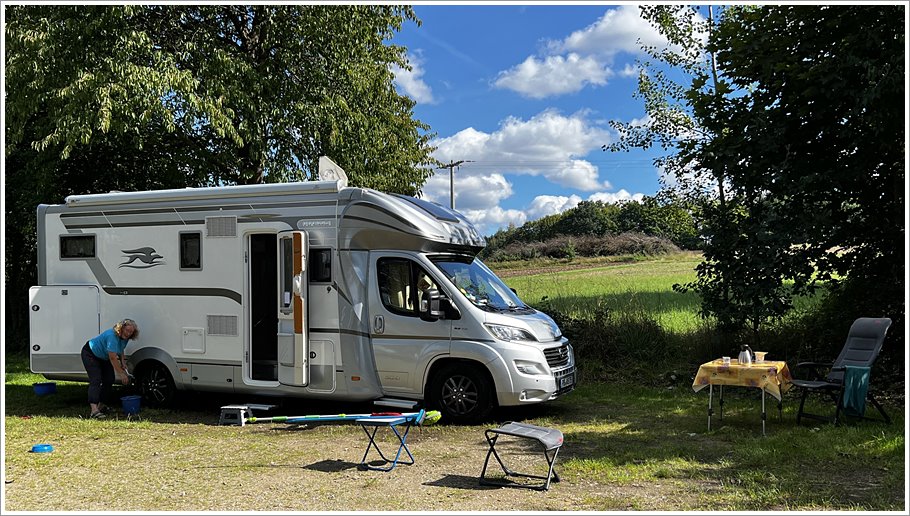 Abfahrt gegen 11 Uhr, Ankunft Bischberg 16 Uhr, wir nehmen Platz 380. Bischberg hat offiziell 250 Stellflächen, die sind unterteilt in grau, blau und rot, steht für 14, 19 oder 29 €. Die Preispolitik ist etwas seltsam, ab 19 Euro hat man auch die Möglichkeit, Strom für extra-Kosten zu nehmen, für 29 darf man, ebenfalls extra zu bezahlen, die Duschen und Toiletten mitbenutzen. Wir brauchen das alles nicht, schon gar nicht die Option darauf.