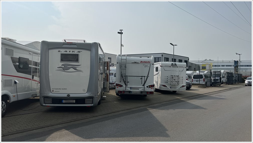 Wie abgesprochen öffnet sich das Eingangstor just in dem Moment, als ich vorfahre. Hartmann ist zum einen ein großer Mercedes Händler, zum anderen ein Wohnmobilhändler. Daher ist das Hartmann Gelände zweigeteilt, auf der einen Seite Mercedes Verkauf, Werkstatt und die Fiat-Halle mit dem Bremsprüfstand und den Hebebühnen für Wohnmobile. Auf der anderen Seite die etwas kleineren Service- und Reparaturhallen für Wohnmobile von Laika, Niesmann, Etrusco, Dethlefs und anderen. Der Womo-Verkauf ist mittlerweile auf ein drittes Areal gewandert.