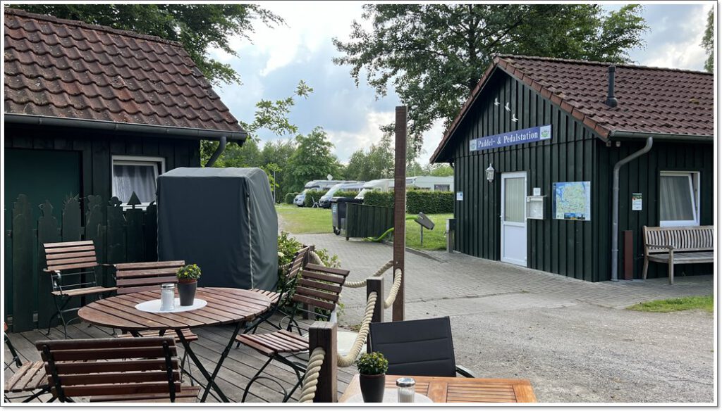 Bei der Abfahrt besuchen wir noch das Einkaufszentrum, dort gibt es verschiedene Märkte wie Aldi, Combi oder Müller, auch Bäcker und andere. Im Paddel & Pedal steht man für 12 € gemütlich und ruhig, das Cafe bietet Frühstück (haben wir nicht genutzt), leckere Torten (haben wir zu Pfingsten genutzt) und leckere Suppen (nicht genutzt). Leider ist die Entsorgung etwas umständlich.