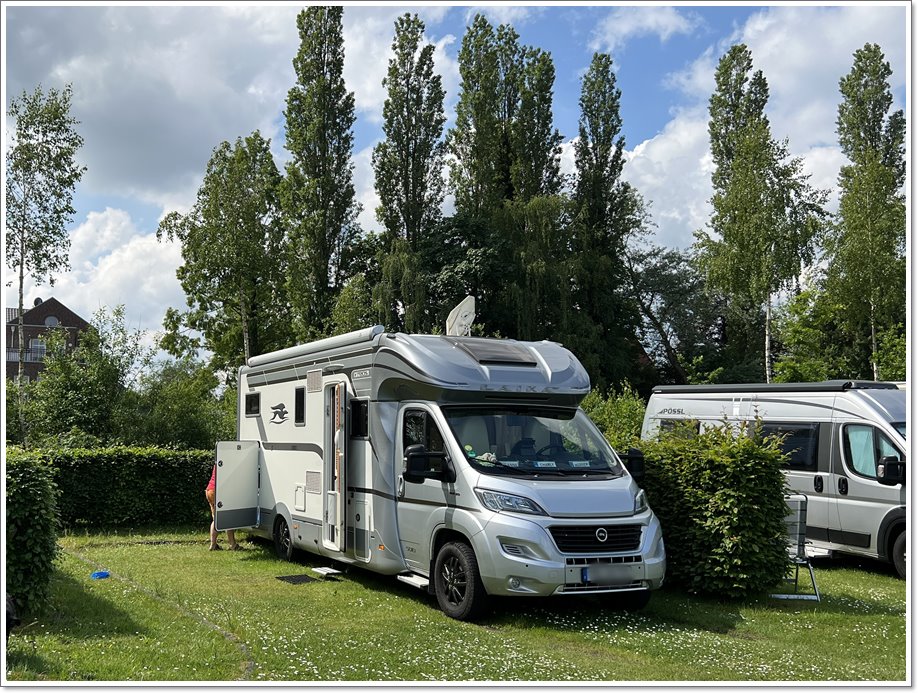 Die Bahn ist nicht sehr voll und es geht gut voran. So kommen wir kurz vor 17 Uhr und ca. 20km vor Papenburg nach Dörpen auf einen großzügigen Stellplatz. Den stellt der Schützenverein hier zur Verfügung, mehrere gut zu befahrene Wiesenflächen und einige gepflasterte Flächen. Alles kann genutzt werden, wenn nicht montags oder donnerstags auf einigen der Flächen Bogenschießen stattfindet.