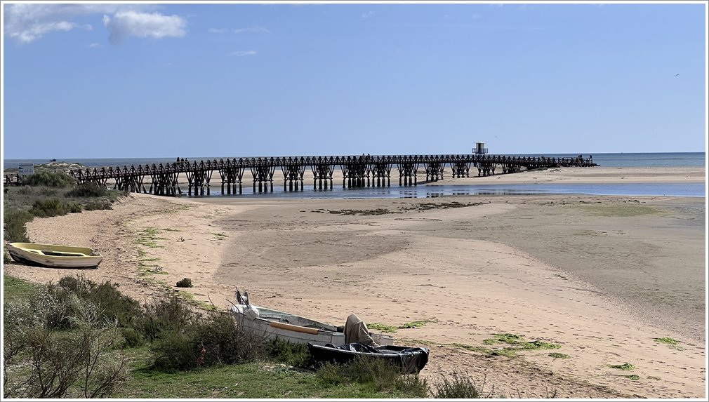Dann weiter entlang der Uferpromenade bis zu einem weit ausladenden Holzsteg, über den man zum Strand gelangt. Der Strand von Isla Christina ist sehr lang und wirkt sauber und aufgeräumt. Wir fahren noch bis zum Campingplatz am östlichen Ende des Orts und schauen uns den an. Bei größerer Hitze bestimmt eine gute Wahl, denn viele Pinien spenden Schatten, stehen aber Satschüsseln und Solarpaneelen im Weg.
