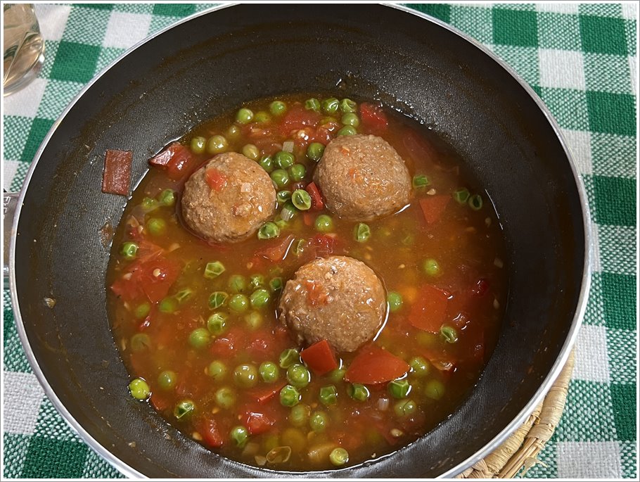 In einem der letzten spanischen Supermärkte fanden wir eine kleine Dose mit Hackfleischbällchen in Soße, darin u.a. Erbsen und Tomaten. Dazu gibt es heute Makkaroni. Die werden wie immer mit wenig Wasser kurz zu Kochen gebracht und an Seite gestellt. Umrühren hin und wieder nicht vergessen, damit‘s nicht klebt oder klumpt.