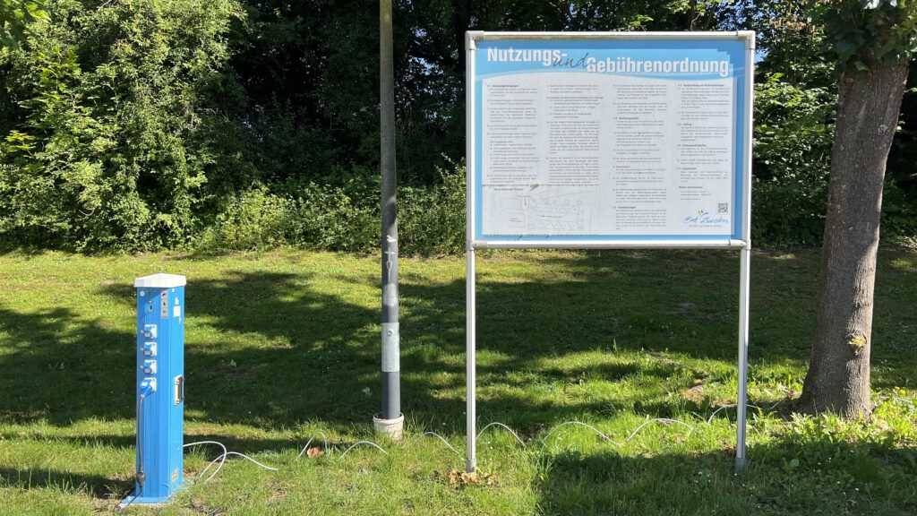 Es gibt Stromsäulen mit 8 Anschlüssen, Ver- und Entsorgung mit Bodeneinlass und zwei Mülleimer. Ebenfalls gibt es an den Stromsäulen Anschlüsse für Kabelfernsehen (ebenfalls 8 Stück),