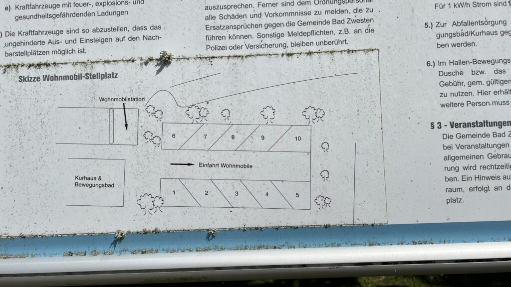 In Bad Zwesten gibt es eine Kurklinik mit einem sehr schön angelegten Kurpark, und direkt daran liegt der Stellplatz. Gleich nebenan das Kurhaus mit Schwimmbad, einer Bücherei und einem Eiscafe. Durch einen Weg am Rande des Kurparks gelangt man in wenigen Minuten in den Ort.